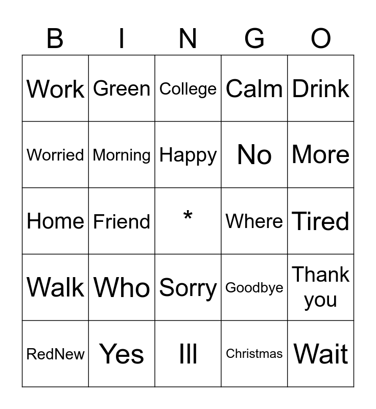 This bingo card has a free space and 39 words: Sit (down), Toilet, Good, Morning, RedNew, Sorry, Happy, Sad, Drink, Walk, Friend, Calm, Wait, Tired, Where, Who, Help, Work, Hello, Goodbye, Worried, Ill, No, More, Which, Lunch, How are you?, Stand (up), Blue, Green, Yellow, Bus, College, Yes, Christmas, Please, Thank you, Home and Go.