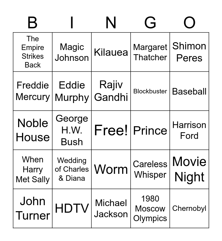 This bingo card has a free space and 73 words: $1.07, $3.55, The Empire Strikes Back, Raging Bull, Blade Runner, The Shining, When Harry Met Sally, Billie Jean, Careless Whisper, Africa, In the Air Tonight, I Want to Break Free, Eddie Murphy, Harrison Ford, Madonna, Magic Johnson, Michael Jackson, Freddie Mercury, Whitney Houston, Prince, Rajiv Gandhi, Margaret Thatcher, Shimon Peres, Bob Hawke, John Turner, Blue Clamp, Jungle, Back to the Future, The Space Shuttle, Compact Discs, HDTV, DNA Fingerprinting, Disposable Cameras, Ronald Reagan, George H.W. Bush, Caspar Weinberger, Jimmy Carter, William Bennett, Chernobyl, Berlin Wall, 1980 Moscow Olympics, Wedding of Charles & Diana, Mount Saint Helens Eruption, AIDS, Space Shuttle Challenger, Blockbuster, Kilauea, Sally Ride, The Covenant, Noble House, E.T., Return of the Jedi, The Talisman, Breakdancing, Slam dancing, Electric Slide, Cabbage Patch, Worm, Cheers, The Cosby Show, The Golden Girls, Magnum, P.I., Miami Vice, Baseball, Football, Basketball, Ice hockey, Soccer, Movie Night, Aerobics, Karaoke, Roller Skating and Sports.