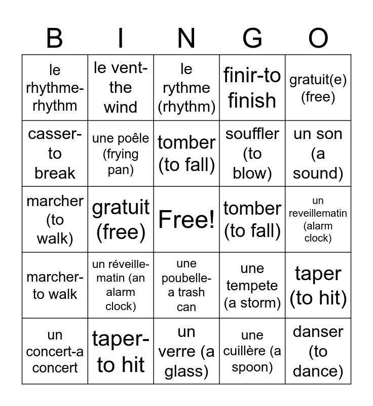 This bingo card has a free space and 54 words: arreter-to stop, marcher-to walk, les freins-brakes, une cuillere-a spoon, une poubelle-a trash can, attacher-to attach, finir-to finish, repondre-to answer, casser-to break, frapper-to knock, le rhythme- rhythm, une casserole-a casserole, taper-to hit, un concert-a concert, une poele (a frying pan), un verre (a glass), danser (to dance), souffler (to blow), ecouter-to listen, un reveillematin (alarm clock), une tempete (a storm), une robinet (a tap), tomber (to fall), gratuit(e) (free), un son-a sound, le vent-the wind, un klaxon-a horn(car), sonner-to sound, arrêter (to stop), une cuillère (a spoon), une poubelle (a trash can), attacher (to attach), finir (to finish), frapper (to knock), le rythme (rhythm), une casserole (a casserole), marcher (to walk), taper (to hit), un concert (a concert), une poêle (frying pan), un verre (a glass), danser (to dance), souffler (to blow), écouter (to listen), un réveille-matin (an alarm clock), une tempête (a storm), les freins (brakes), un robinet (a tap), tomber (to fall), gratuit (free), un son (a sound), le vent (the wind), un klaxon (a horn) and sonner (to ring).