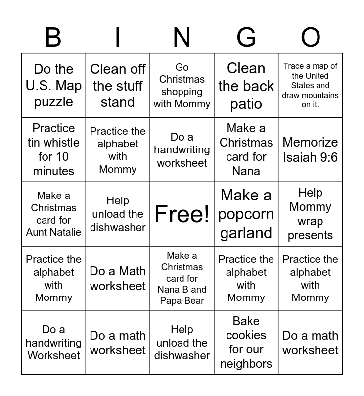 This bingo card has a free space and 24 words: Do a Math worksheet, Do a math worksheet, Do a handwriting worksheet, Do a handwriting Worksheet, Trace a map of the United States and draw mountains on it., Do the U.S. Map puzzle, Practice tin whistle for 10 minutes, Clean off the stuff stand, Make a popcorn garland, Make a Christmas card for Nana B and Papa Bear, Make a Christmas card for Nana, Make a Christmas card for Aunt Natalie, Practice the alphabet with Mommy, Practice the alphabet with Mommy, Practice the alphabet with Mommy, Bake cookies for our neighbors, Help Mommy wrap presents, Go Christmas shopping with Mommy, Memorize Isaiah 9:6, Help unload the dishwasher, Do a math worksheet, Practice the alphabet with Mommy, Clean the back patio and Help unload the dishwasher.