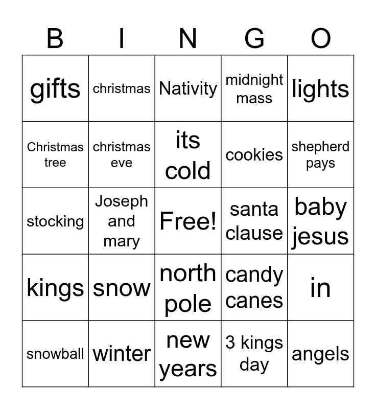 This bingo card has a free space and 24 words: snow, winter, its cold, snowball, lights, gifts, Christmas tree, christmas, santa clause, north pole, cookies, stocking, candy canes, in, christmas eve, 3 kings day, baby jesus, Nativity, shepherd pays, Joseph and mary, angels, kings, midnight mass and new years.
