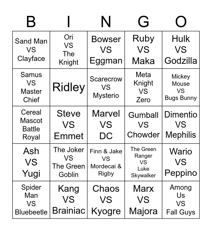 This bingo card has a free space and 24 words: The Joker VS The Green Goblin, Kang VS Brainiac, Scarecrow VS Mysterio, Spider Man VS Bluebeetle, Hulk VS Godzilla, Sand Man VS Clayface, Samus VS Master Chief, Ori VS The Knight, Gumball VS Chowder, Finn & Jake VS Mordecai & Rigby, Meta Knight VS Zero, Cereal Mascot Battle Royal, The Green Ranger VS Luke Skywalker, Wario VS Peppino, Ridley, Marx VS Majora, Dimentio VS Mephilis, Bowser VS Eggman, Mickey Mouse VS Bugs Bunny, Steve VS Emmet, Among Us VS Fall Guys, Ash VS Yugi, Ruby VS Maka and Chaos VS Kyogre.