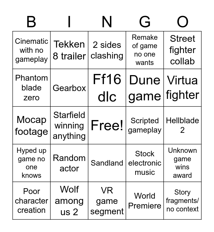 This bingo card has a free space and 67 words: Fortnite trailer, 10 min music break, Elden ring dlc, Unknown game wins award, Black myth, Bg3 goty, Tekken 8 trailer, Vague indie game trailer, Ff16 dlc, Foamstars, Sandland, Marathon, Hellblade 2, Street fighter collab, Street fighter Ed, Phantom blade zero, Starfield winning anything, Cinematic with no gameplay, Trailer with gameplay, Dune game, Random actor, Hyped up game no one knows, Remake of game no one wants, World Premiere, Dev speech you cant understand, Skit, Persona 6, Jet set radio, Virtua fighter, Cut off before gameplay, Story fragments/ no context, Only walking in the world, Grabs the camera, Breaking the 4th wall, Pirates, Poor character creation, Royalty free hip hop, Stock electronic music, Mocap footage, Trailer with no character, Talking gun, Gearbox, Scripted gameplay, “First time in gaming”, Lovecraftian horror, Demon child, War footage, Wolf among us 2, Non mobile gatcha, “Non mobile” mobile game, 2 sides clashing, Major rapper for trailer music, PRONOUNS, Obviously lgbt character, Loc comb over (black character), VR game segment, Mascot on stage, Simulator game, No release date trailer, Title card only trailer, Among us, Obscure anime game trailer, Switch port, BS collectors edition, Delayed game, Sword and spell and 20 second or less trailer.