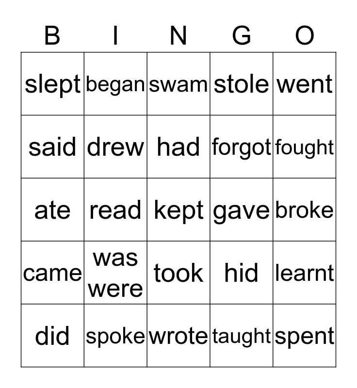 This bingo card has a free space and 24 words: was were, spoke, had, did, went, slept, said, began, gave, took, forgot, ate, hid, learnt, drew, taught, broke, swam, fought, read, spent, came, stole and wrote.