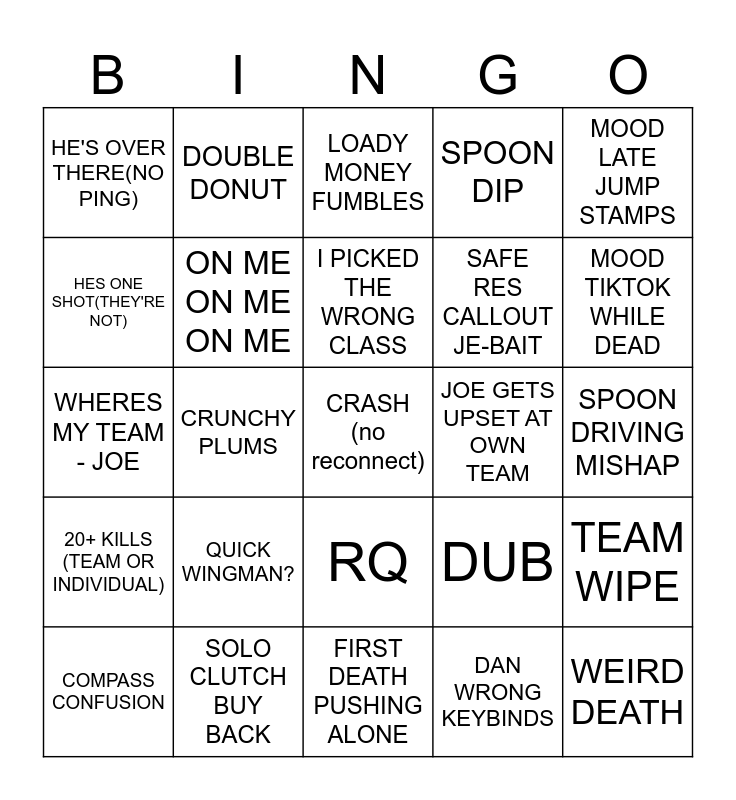 This bingo card has 25 words: QUICK WINGMAN?, FIRST DEATH PUSHING ALONE, I PICKED THE WRONG CLASS, COMPASS CONFUSION, MOOD LATE JUMP STAMPS, HE'S OVER THERE(NO PING), HES ONE SHOT(THEY'RE NOT), DOUBLE DONUT, JOE GETS UPSET AT OWN TEAM, RQ, SAFE RES CALLOUT JE-BAIT, WHERES MY TEAM - JOE, DUB, TEAM WIPE, ON ME ON ME ON ME, WEIRD DEATH, SPOON DRIVING MISHAP, LOADY MONEY FUMBLES, MOOD TIKTOK WHILE DEAD, CRUNCHY PLUMS, CRASH (no reconnect), SOLO CLUTCH BUY BACK, 20+ KILLS (TEAM OR INDIVIDUAL), SPOON DIP and DAN WRONG KEYBINDS.
