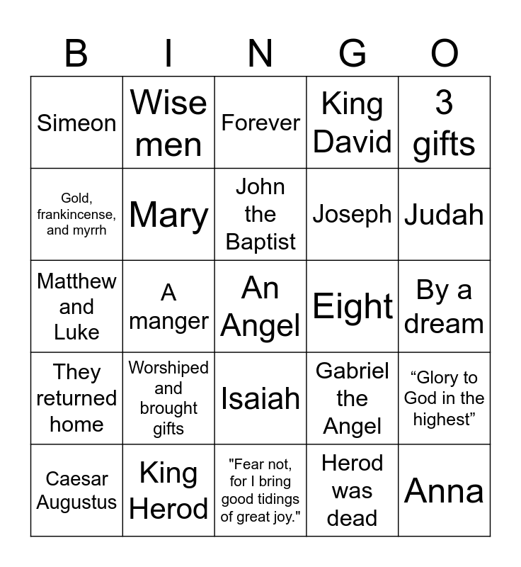 This bingo card has 49 words: He was silent until John was born, An Angel, Adam and Eve after the Fall, "Fear not, for I bring good tidings of great joy.", Worshiped and brought gifts, A star, Wise men, Immanuel, Gold, frankincense, and myrrh, Kill all the male children, Mary, King David, “Glory to God in the highest”, Gabriel the Angel, The Shepherds, They found Jesus, John the Baptist, Eight, Micah, 3 gifts, A manger, Herod was dead, Simeon, Joseph, The Passover, Judah, Caesar Augustus, It doesn’t say, Isaiah, They returned home, Bethlehem, Jeremiah, To worship Jesus, Shepherds, King Herod, No room in the Inn, Nazareth, Holy Spirit, By a dream, Carpentry, Zechariah, Jesus, Anna, Filled with great fear, Matthew and Luke, Forever, She was afraid, God with us and Herod's decree.