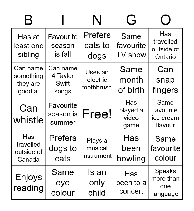 This bingo card has a free space and 24 words: Prefers dogs to cats, Same eye colour, Uses an electric toothbrush, Enjoys reading, Has travelled outside of Ontario, Has at least one sibling, Can name something they are good at, Favourite season is fall, Has played a video game, Plays a musical instrument, Same month of birth, Can whistle, Has been bowling, Same favourite colour, Can name 4 Taylor Swift songs, Has been to a concert, Same favourite ice cream flavour, Prefers cats to dogs, Can snap fingers, Favourite season is summer, Speaks more than one language, Has travelled outside of Canada, Same favourite TV show and Is an only child.