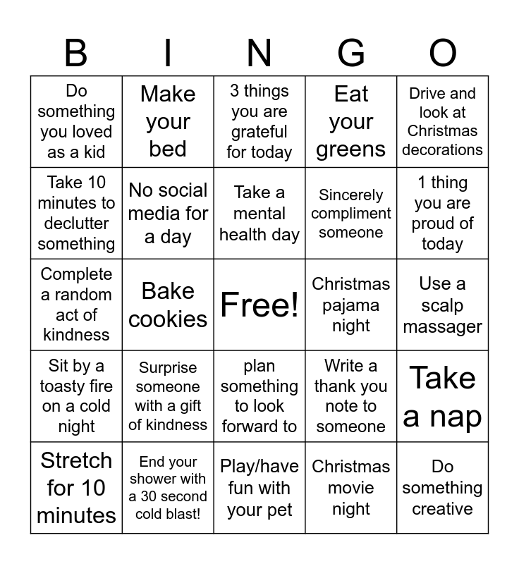 This bingo card has a free space and 35 words: Drink Enough Water, 30 minutes in nature, Take a long bath, No social media for a day, plan something to look forward to, Eat your greens, Take 10 minutes to declutter something, Go to sleep early, Take a mental health day, Spend the day relaxing, Complete a random act of kindness, Drive and look at Christmas decorations, Donate to your favorite charity, Donate food or blankets to a shelter, Do something you loved as a kid, Christmas pajama night, Christmas movie night, Bake cookies, Sit by a toasty fire on a cold night, Do something creative, Write a thank you note to someone, Stretch for 10 minutes, Take a nap, End your shower with a 30 second cold blast!, 3 things you are grateful for today, 1 thing you are proud of today, Send a text sharing gratitude for someone, Cuddle a loved one or pet, Sincerely compliment someone, Use a scalp massager, Have a square of dark chocolate, Play/have fun with your pet, Surprise someone with a gift of kindness, Make your bed and Deep belly breathing for a few minutes.