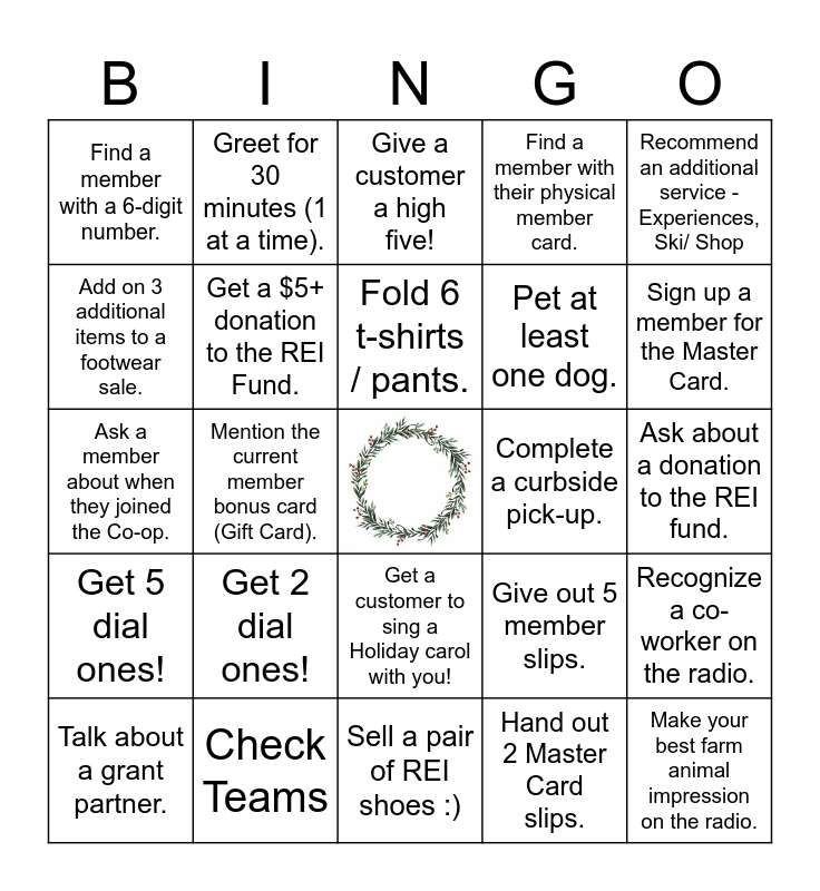 This bingo card has a free space and 24 words: Talk about a grant partner., Get 2 dial ones!, Fold 6 t-shirts / pants., Hand out 2 Master Card slips., Recommend an additional service - Experiences, Ski/ Shop, Find a member with a 6-digit number., Greet for 30 minutes (1 at a time)., Give a customer a high five!, Complete a curbside pick-up., Ask about a donation to the REI fund., Ask a member about when they joined the Co-op., Get a $5+ donation to the REI Fund., Give out 5 member slips., Recognize a co-worker on the radio., Add on 3 additional items to a footwear sale., Check Teams, Sell a pair of REI shoes :), Find a member with their physical member card., Sign up a member for the Master Card., Get 5 dial ones!, Mention the current member bonus card (Gift Card)., Get a customer to sing a Holiday carol with you!, Pet at least one dog. and Make your best farm animal impression on the radio..