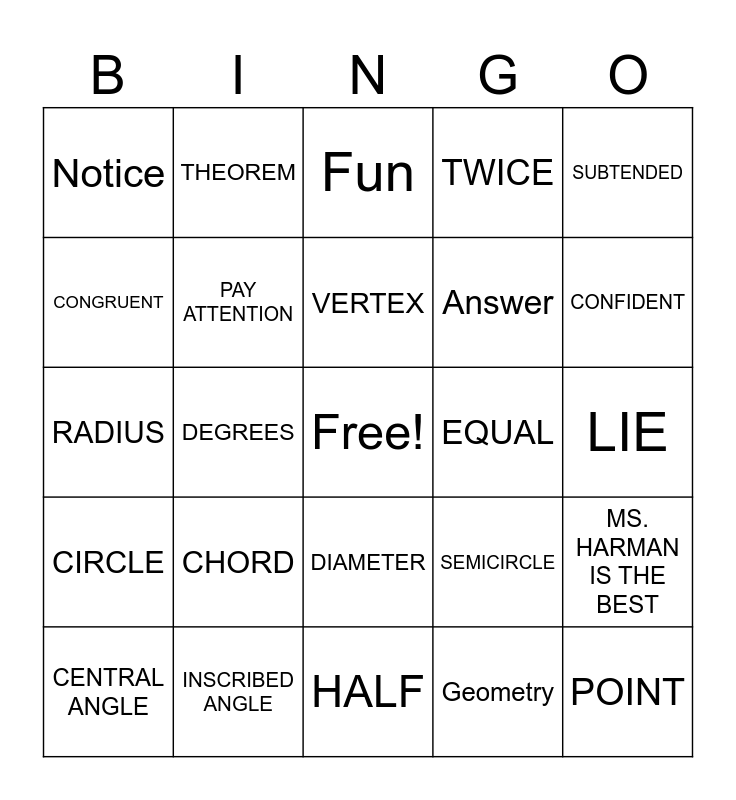 This bingo card has a free space and 24 words: CHORD, INSCRIBED ANGLE, VERTEX, CENTRAL ANGLE, SUBTENDED, Notice, CONGRUENT, THEOREM, EQUAL, DIAMETER, Answer, RADIUS, SEMICIRCLE, MS. HARMAN IS THE BEST, PAY ATTENTION, Geometry, LIE, Fun, CONFIDENT, DEGREES, POINT, CIRCLE, TWICE and HALF.