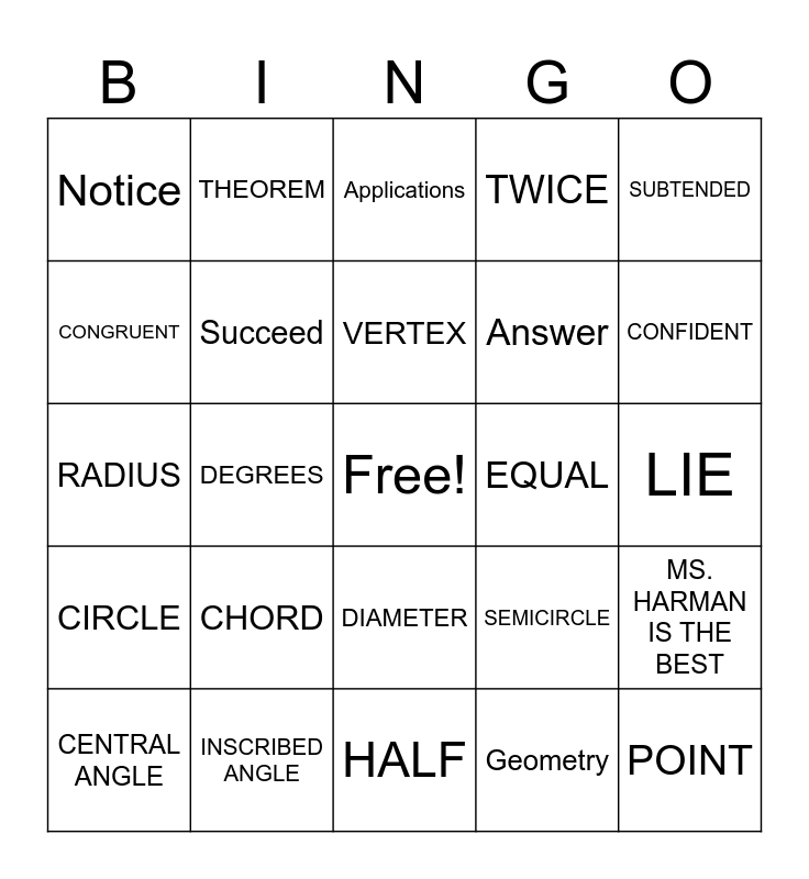 This bingo card has a free space and 24 words: CHORD, INSCRIBED ANGLE, VERTEX, CENTRAL ANGLE, SUBTENDED, Notice, CONGRUENT, THEOREM, EQUAL, DIAMETER, Answer, RADIUS, SEMICIRCLE, MS. HARMAN IS THE BEST, Succeed, Geometry, LIE, Applications, CONFIDENT, DEGREES, POINT, CIRCLE, TWICE and HALF.