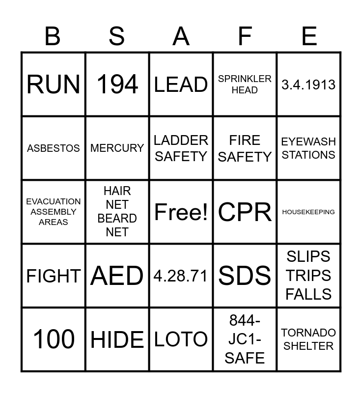 This bingo card has a free space and 27 words: SDS, PPE, FIRE SAFETY, LOTO, ASBESTOS, LEAD, 194, FIGHT, CPR, SLIPS TRIPS FALLS, EVACUATION ASSEMBLY AREAS, SPRINKLER HEAD, 100, HIDE, EYEWASH STATIONS, EMERGENCY EXIT, MERCURY, LADDER SAFETY, AED, RUN, HOUSEKEEPING, 844-JC1-SAFE, HAIR NET BEARD NET, TORNADO SHELTER, 4.28.71, 3.4.1913 and 198.