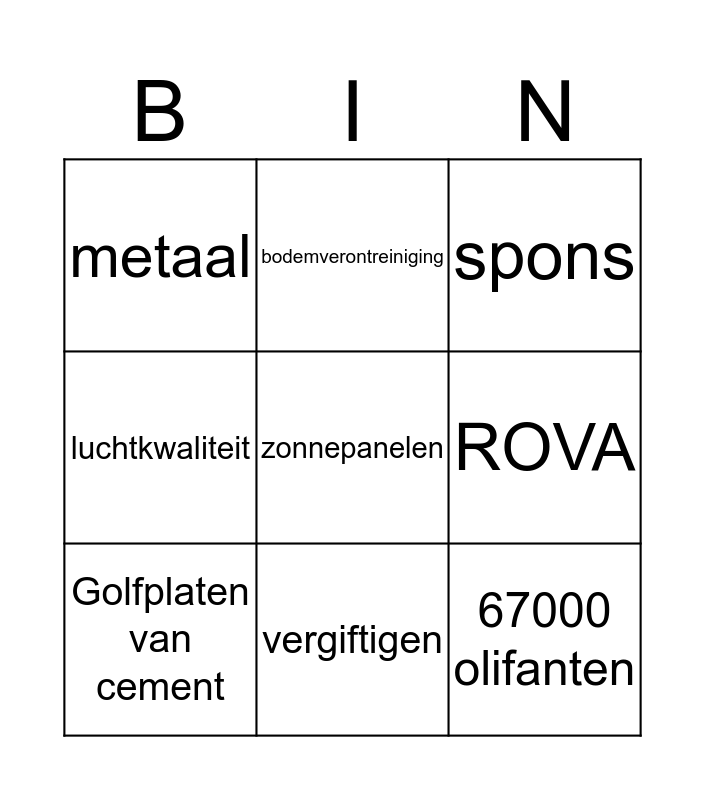 This bingo card has 9 words: Golfplaten van cement, spons, bodemverontreiniging, luchtkwaliteit, metaal, ROVA, zonnepanelen, 67000 olifanten and vergiftigen.