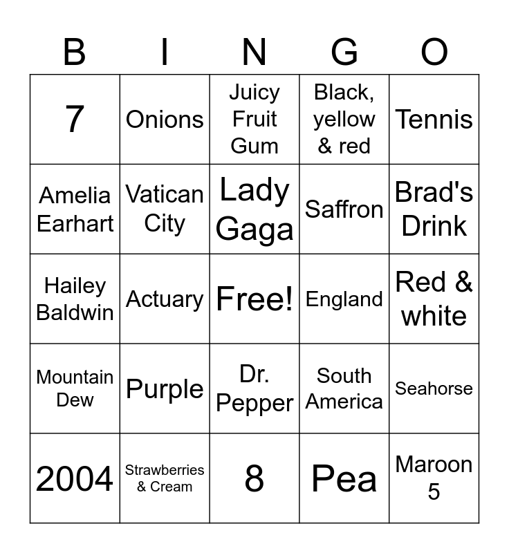 This bingo card has a free space and 83 words: Cocaine, Ketchup, Juicy Fruit Gum, Murder, Jellyfish, Nose, Polar Bear, Canada, Venice, Africa, Asia, Australia, Vatican City, England, France, 7, 2004, Amelia Earhart, Leonardo da Vinci, Books, Sage, Saffron, Maroon 5, Madonna, Actuary, Cumin, Basil, Yellow, Black, Yellow & blue, Purple, Britney Spears, Miley Cyrus, Hailey Baldwin, Clint Eastwood, Fingers, 8, Flowers, Brad's Drink, Mountain Dew, IBC Root Beer, 1888, Tree, Green, 11, Three, Onions, Red bell pepper, 2000, Arms, South America, Black, yellow & red, Red & white, John Travolta, Taylor Swift, Johnny Depp, Sting, Wrestling, Strawberries & Cream, Lacrosse, Genesis, Black, Sperm whale, Tennis, 3, Seahorse, Turkey, Scotland, DJ Jazzy Jeff & The Fresh Prince, Coca-Cola, Potato, Sailfish, Drones, Dr. Pepper, Pea, Hummingbirds, 4, Lady Gaga, 12, California, Arizona, Emu and Madonna.