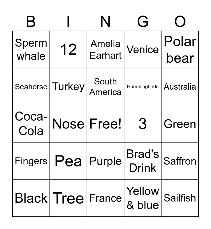 This bingo card has a free space and 82 words: Books, Leonardo da Vinci, Amelia Earhart, 2004, Actuary, Madonna, Maroon 5, DJ Jazzy Jeff & The Fresh Prince, Scotland, Lacrosse, Strawberries & Cream, Wrestling, Turkey, 3, Tennis, Sperm whale, Black, Seahorse, Emu, Drones, 4, Hummingbirds, Sailfish, Polar bear, Nose, Jellyfish, Murder, Juicy Fruit Gum, Ketchup, Cocaine, Pea, Potato, Coca-Cola, Dr. Pepper, 7, France, England, Vatican City, Australia, Asia, Africa, Venice, Canada, Arizona, California, 12, Lady Gaga, South America, Arms, 3, 11, Green, Tree, 1888, 2000, Red bell pepper, Onions, IBC Root Beer, Mountain Dew, Brad's Drink, Flowers, 8, Fingers, Clint Eastwood, Taylor Swift, John Travolta, Hailey Baldwin, Miley Cyrus, Genesis, Sting, Johnny Depp, Britney Spears, Purple, Yellow & blue, Red & white, Black, yellow & red, Black, Yellow, Basil, Cumin, Saffron and Sage.