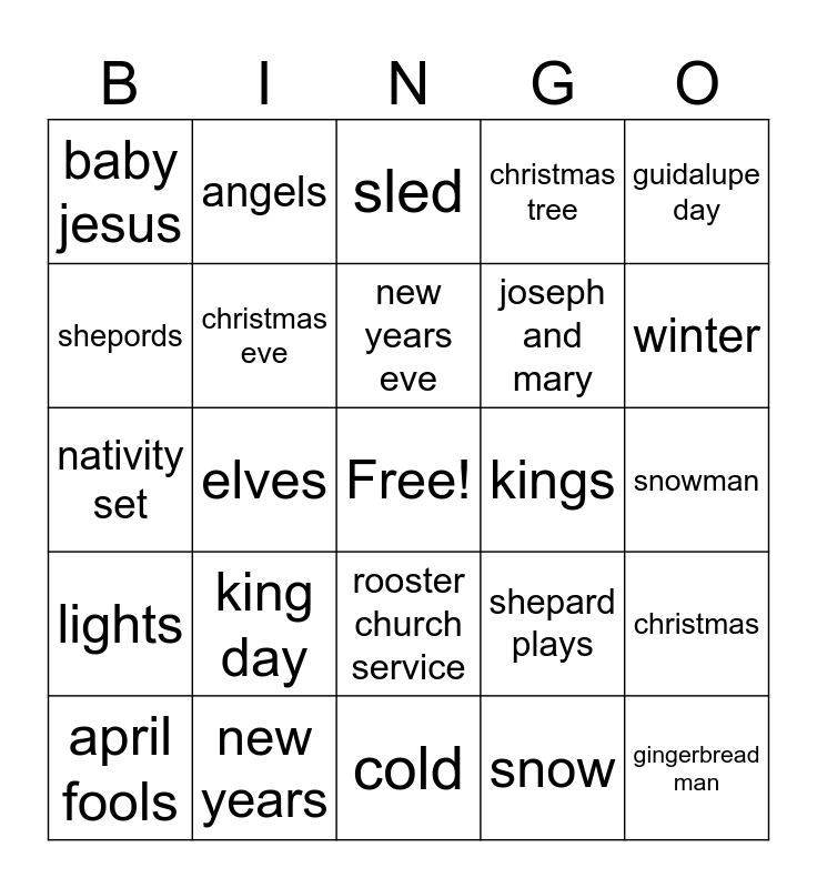 This bingo card has a free space and 24 words: king day, new years, new years eve, april fools, guidalupe day, baby jesus, shepords, angels, kings, rooster church service, joseph and mary, nativity set, shepard plays, christmas, christmas eve, snow, snowman, sled, winter, elves, gingerbread man, lights, christmas tree and cold.
