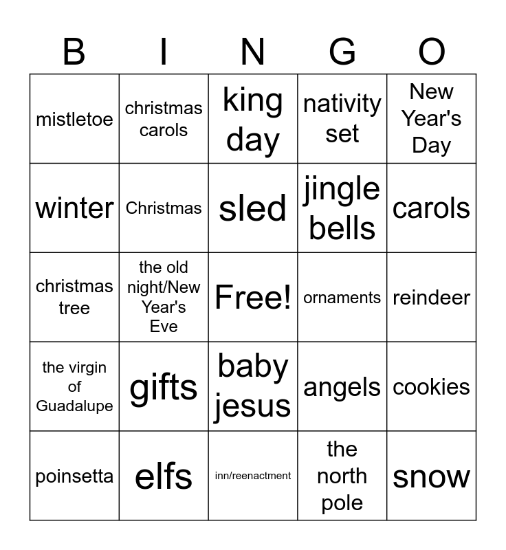 This bingo card has a free space and 24 words: gifts, elfs, sled, poinsetta, New Year's Day, mistletoe, winter, christmas carols, ornaments, baby jesus, jingle bells, christmas tree, angels, cookies, Christmas, the north pole, reindeer, king day, carols, the old night/New Year's Eve, snow, the virgin of Guadalupe, nativity set and inn/reenactment.