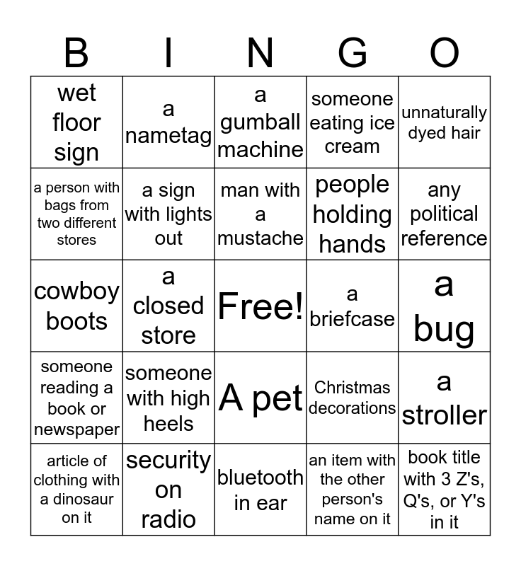 This bingo card has a free space and 24 words: someone with high heels, security on radio, man with a mustache, article of clothing with a dinosaur on it, unnaturally dyed hair, wet floor sign, a person with bags from two different stores, a nametag, a briefcase, A pet, people holding hands, cowboy boots, Christmas decorations, a stroller, a sign with lights out, an item with the other person's name on it, a bug, a gumball machine, any political reference, a closed store, book title with 3 Z's, Q's, or Y's in it, someone reading a book or newspaper, someone eating ice cream and bluetooth in ear.