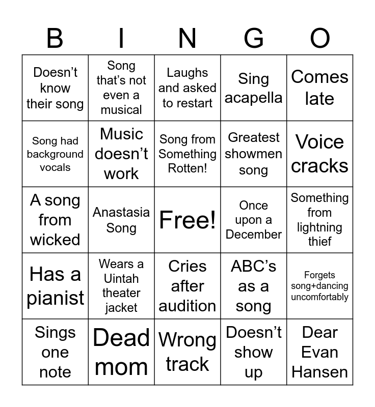 This bingo card has a free space and 30 words: Dead mom, Watch what happens, Anastasia Song, Two repeats, Doesn’t know their song, Laughs and asked to restart, Music doesn’t work, Cries after audition, Once upon a December, Wrong track, Something from lightning thief, Dear Evan Hansen, Doesn’t show up, Forgets song name, Voice cracks, Says they are fighting a cold, ABC’s as a song, Has a pianist, Wears a Uintah theater jacket, Comes late, A song from wicked, Song from an unknown musical, Song that’s not even a musical, Greatest showmen song, Song had background vocals, Sing acapella, Forgets song+dancing uncomfortably, Sings one note, Song from Something Rotten! and Not dressed up/Casual.