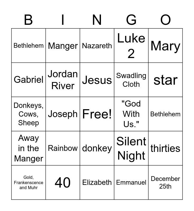 This bingo card has a free space and 24 words: Rainbow, 40, Jesus, Gold, Frankenscence and Muhr, Mary, Bethlehem, Gabriel, Manger, "God With Us.", donkey, Swadling Cloth, Donkeys, Cows, Sheep, Silent Night, thirties, Jordan River, Emmanuel, Bethlehem, Nazareth, star, Joseph, December 25th, Away in the Manger, Luke 2 and Elizabeth.