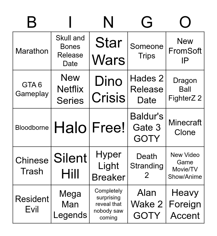 This bingo card has a free space and 24 words: Silent Hill, Mega Man Legends, Dino Crisis, Resident Evil, New FromSoft IP, Marathon, GTA 6 Gameplay, Skull and Bones Release Date, Baldur's Gate 3 GOTY, Hyper Light Breaker, Hades 2 Release Date, Bloodborne, Death Stranding 2, New Video Game Movie/TV Show/Anime, New Netflix Series, Alan Wake 2 GOTY, Minecraft Clone, Star Wars, Dragon Ball FighterZ 2, Halo, Heavy Foreign Accent, Chinese Trash, Someone Trips and Completely surprising reveal that nobody saw coming.