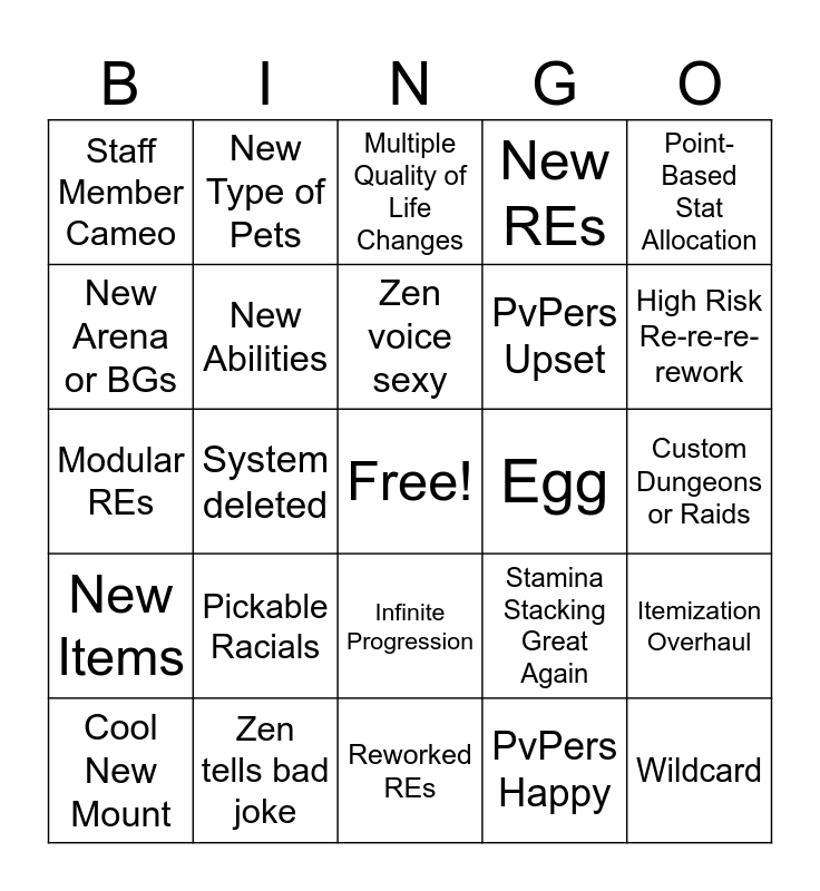 This bingo card has a free space and 24 words: Pickable Racials, Zen tells bad joke, Zen voice sexy, Cool New Mount, Point-Based Stat Allocation, Staff Member Cameo, New Arena or BGs, New Type of Pets, Egg, Infinite Progression, PvPers Upset, Modular REs, Stamina Stacking Great Again, Itemization Overhaul, New Abilities, PvPers Happy, Custom Dungeons or Raids, Multiple Quality of Life Changes, High Risk Re-re-re-rework, System deleted, Wildcard, New Items, New REs and Reworked REs.