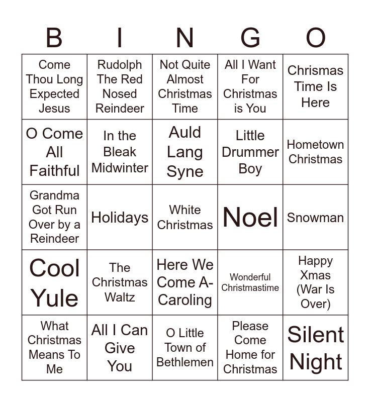 This bingo card has 50 words: The Christmas Song, White Christmas, It's Begining to Look a Lot Like Christmas, O Little Town of Bethlemen, The Christmas Waltz, It Came Upon a Midnight Clear, Rudolph The Red Nosed Reindeer, What Child Is This?, O Come All Faithful, Winter Prayers, In the Bleak Midwinter, All I Want For Christmas is You, Happy Xmas (War Is Over), Wonderful Christmastime, Holly Jolly Christmas, We Wish You A Merry Christmas, Auld Lang Syne, Noel, This Christmas, Chrismas Time Is Here, Holidays, Please Come Home for Christmas, Come Thou Long Expected Jesus, Little Drummer Boy, Joy To The World, Silent Night, Hometown Christmas, If We Make It Through December, Not Quite Almost Christmas Time, Here We Come A-Caroling, Home For The Holidays, Merry Christmas, Happy Holidays, Nothing for Christmas, I Had a Heart, All I Can Give You, Sleigh Ride, Jingle Bell Rock, Silver Bell, Do They Know It's Christmas?, Snowman, Candy Cane Lane, Carol of the Bells, Santa Claus is Coming To Town, Mele Kalikimaka, What Christmas Means To Me, Grandma Got Run Over by a Reindeer, Home for the Holidays, Thank God It's Christmas, Cool Yule and Father Christmas.