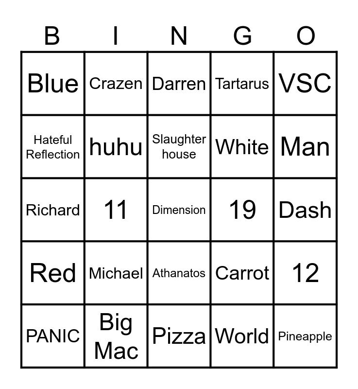 This bingo card has 25 words: Michael, Pizza, Slaughter house, PANIC, VSC, Blue, Hateful Reflection, Crazen, 19, Athanatos, White, Richard, Carrot, 12, huhu, Pineapple, Dash, Darren, Man, 11, Dimension, Big Mac, Red, Tartarus and World.