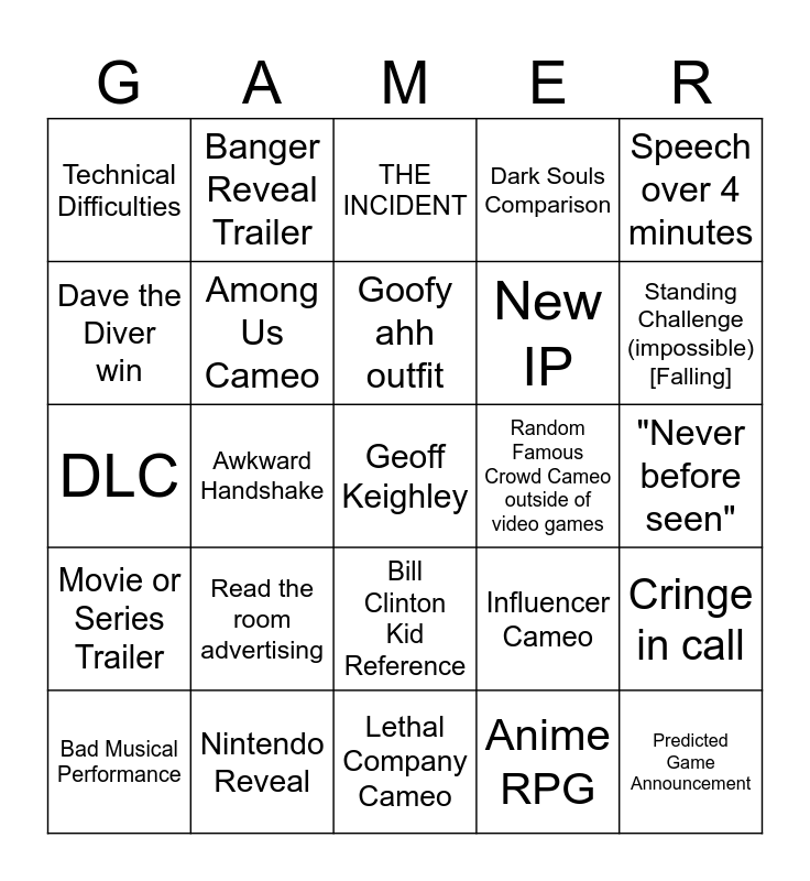 This bingo card has a free space and 34 words: CGI Trailer, Anime RPG, Mispronounciation, Awkward Silence, Movie or Series Trailer, Among Us Cameo, Speech over 4 minutes, Bad Musical Performance, Banger Reveal Trailer, Sydney Goodman, Goofy ahh outfit, THE INCIDENT, Robbed Award, Try not to cry challenge, Random Famous Crowd Cameo outside of video games, Standing Challenge (impossible) [Falling], Nintendo Reveal, DLC, Read the room advertising, Influencer Cameo, Bill Clinton Kid Reference, "Revolutionary", Technical Difficulties, "Never before seen", Lethal Company Cameo, Predicted Game Announcement, Dark Souls Comparison, One game wins 3 awards, New IP, Dave the Diver win, GTA VI, Awkward Handshake, Cringe in call and Politics.