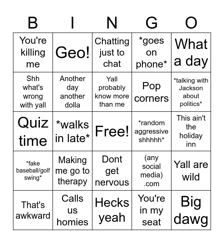 This bingo card has a free space and 35 words: That's a twist, *drumming hands on podium*, Snaps/claps, Another day another dolla, Dont get nervous, *goes on phone*, Shh what's wrong with yall, *leaves class*, Yall probably know more than me, Cool x100, Quiz time, What a day, *goes on a tangent* where was I?, You're making my ADD act up, You're killing me, *random aggressive shhhhh*, You're in my seat, *walks in late*, *fake baseball/golf swing*, Big dawg, (any social media) .com, That's awkward, Yall are wild, Calls us homies, Chatting just to chat, *talking with Jackson about politics*, *Moves someone*, Diet coke, Pop corners, This ain't the holiday inn, *moves someone*, Hecks yeah, Making me go to therapy, Geo! and *Unzipped parachute pants*.
