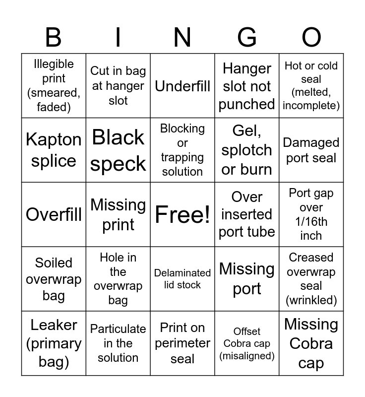 This bingo card has a free space and 31 words: Print on perimeter seal, Print color mix, Missing print, Missing bar code, Illegible print (smeared, faded), Underfill, Black speck, Missing port, Over inserted port tube, Offset Cobra cap (misaligned), Port gap over 1/16th inch, Missing Cobra cap, Crushed port, Cracked tube, Damaged port seal, Arc out on Cobra Cap, Creased overwrap seal (wrinkled), Hole in the overwrap bag, Soiled overwrap bag, Delaminated lid stock, Hot or cold seal (melted, incomplete), Excessive moisture, Leaker (primary bag), Cut in bag at hanger slot, Gel, splotch or burn, Kapton splice, Hanger slot not punched, Overfill, Particulate in the solution, Blocking or trapping solution and Burnt or dried solution on primary bag.