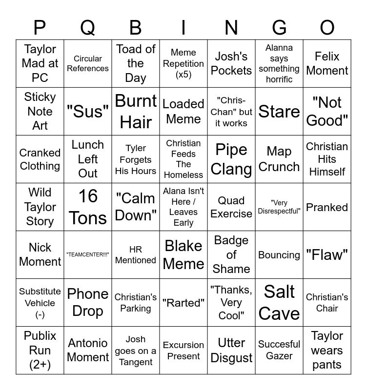 This bingo card has a free space and 48 words: "Thanks, Very Cool", Stare, Excursion Present, 16 Tons, Tyler Forgets His Hours, Pranked, Circular References, Antonio Moment, Alanna says something horrific, Blake Meme, Felix Moment, Meme Repetition (x5), Map Crunch, Pipe Clang, Substitute Vehicle (-), "Very Disrespectful", Sticky Note Art, "Not Good", Salt Cave, Josh's Pockets, "Chris-Chan" but it works, "Calm Down", Taylor Mad at PC, "Sus", Christian's Chair, Burnt Hair, Christian Hits Himself, Publix Run (2+), Christian Feeds The Homeless, Lunch Left Out, Succesful Gazer, Quad Exercise, "Flaw", Phone Drop, Wild Taylor Story, Badge of Shame, Bouncing, Cranked Clothing, HR Mentioned, Christian's Parking, Nick Moment, Taylor wears pants, Toad of the Day, Josh goes on a Tangent, Loaded Meme, "Rarted", "TEAMCENTER!!!" and Utter Disgust.