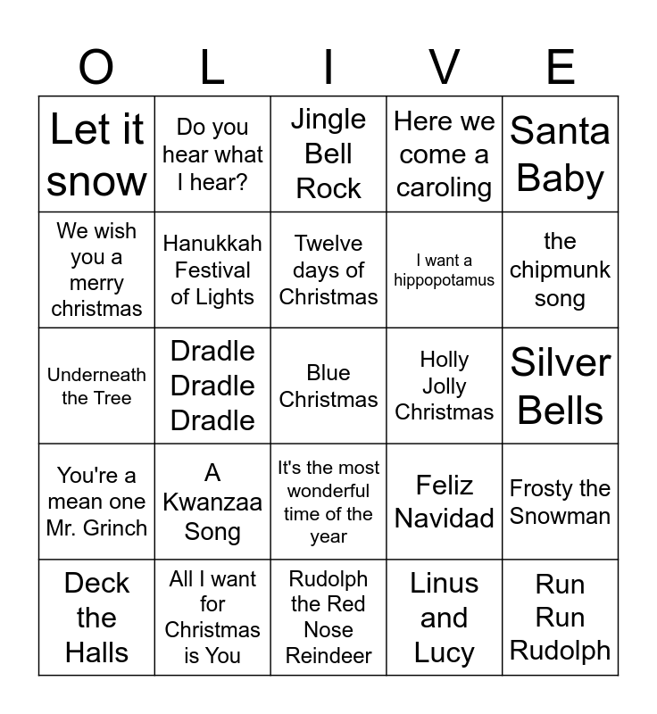 This bingo card has 30 words: All I want for Christmas is You, Last Christmas, Dradle Dradle Dradle, Rockin around the Christmas Tree, Let it snow, Jingle Bell Rock, Hanukkah Festival of Lights, It's the most wonderful time of the year, Holly Jolly Christmas, Rudolph the Red Nose Reindeer, Silver Bells, Blue Christmas, Linus and Lucy, Run Run Rudolph, the chipmunk song, I saw mommy kissing Santa Clause, Feliz Navidad, You're a mean one Mr. Grinch, A Kwanzaa Song, Santa Baby, Underneath the Tree, Carol of the Bells, Do you hear what I hear?, I want a hippopotamus, We wish you a merry christmas, Here we come a caroling, Frosty the Snowman, Deck the Halls, Twelve days of Christmas and Dance of the Sugarplum Fairy.