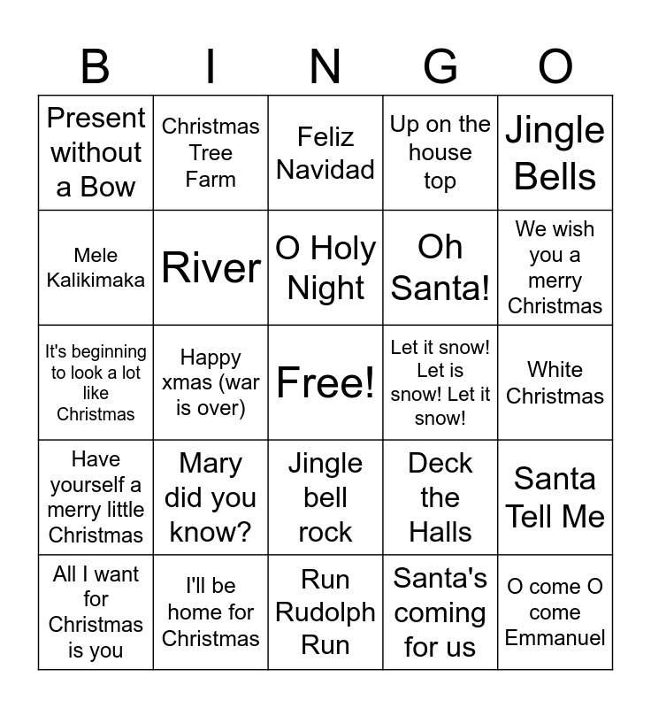 This bingo card has a free space and 52 words: Do they know it's Christmas?, O come O come Emmanuel, Frosty the Snowman, Run Rudolph Run, Mary did you know?, Like it's Christmas, Christmas Tree Farm, Blue Christmas, Mele Kalikimaka, Candy Cane Lane, River, Sleigh Ride, Santa Tell Me, Deck the Halls, Silver Bells, Silent Night, O Holy Night, Let it snow! Let is snow! Let it snow!, Santa Baby, Jingle Bells, Happy xmas (war is over), Santa's coming for us, Present without a Bow, Oh Santa!, You Make it feel like Christmas, Hard Candy Christmas, I want a Hippo for Christmas, Grandma got run over by a reindeer, We wish you a merry Christmas, 12 days of Christmas, Rudolph the red-nosed reindeer, Up on the house top, The chipmunk song, Hark the Herald angels sing, God rest ye merry gentlemen, Feliz Navidad, I'll be home for Christmas, The Christmas song (chestnuts roasting), I saw Mommy kissing Santa Claus, Santa Claus is coming to town, It's the most wonderful time of the year, White Christmas, Have yourself a merry little Christmas, You're a mean one Mr. Grinch, Jingle bell rock, Holly jolly Christmas, Mistletoe, It's beginning to look a lot like Christmas, Last Christmas, Rockin' around the Christmas tree, All I want for Christmas is you and Baby it's cold outside.