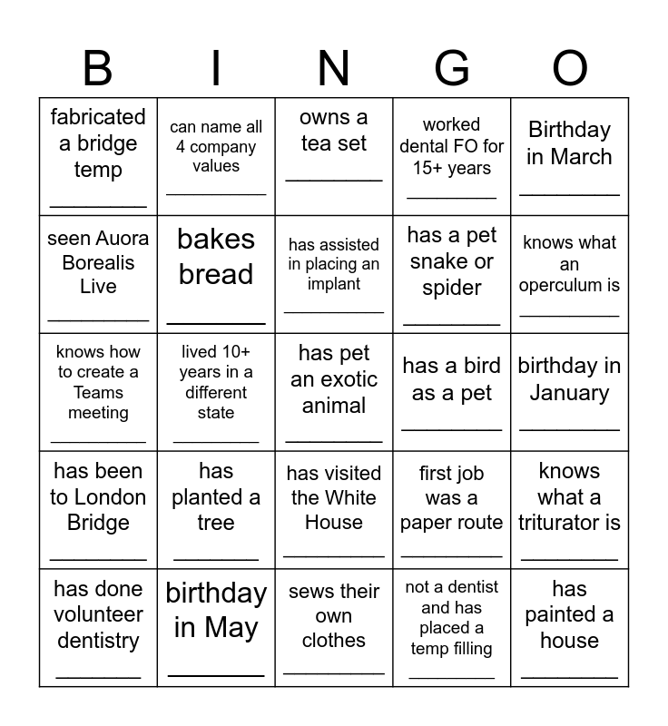 This bingo card has a free space and 24 words: has planted a tree _______, birthday in May ______, has assisted in placing an implant ___________, has done volunteer dentistry _______, Birthday in March ________, fabricated a bridge temp ________, seen Auora Borealis Live _________, can name all 4 company values ___________, has a bird as a pet ________, has visited the White House _________, has a pet snake or spider ________, knows how to create a Teams meeting __________, first job was a paper route _________, knows what a triturator is ________, bakes bread ______, not a dentist and has placed a temp filling _________, birthday in January ________, owns a tea set ________, knows what an operculum is __________, lived 10+ years in a different state _________, has painted a house ________, has been to London Bridge ________, worked dental FO for 15+ years _________ and sews their own clothes _________.