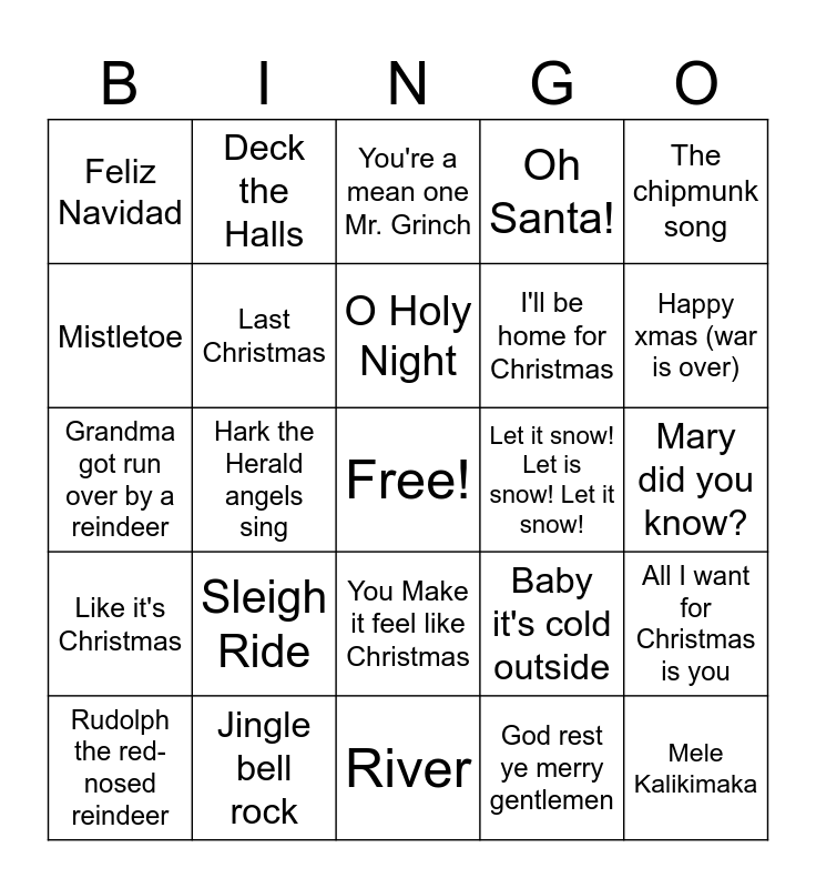 This bingo card has a free space and 52 words: Blue Christmas, Mele Kalikimaka, Candy Cane Lane, River, Sleigh Ride, Santa Tell Me, Deck the Halls, Holly jolly Christmas, Mistletoe, It's beginning to look a lot like Christmas, Last Christmas, Rockin' around the Christmas tree, All I want for Christmas is you, Baby it's cold outside, Silver Bells, Silent Night, O Holy Night, Let it snow! Let is snow! Let it snow!, Santa Baby, The chipmunk song, Hark the Herald angels sing, God rest ye merry gentlemen, Feliz Navidad, I'll be home for Christmas, The Christmas song (chestnuts roasting), I saw Mommy kissing Santa Claus, Santa Claus is coming to town, Jingle Bells, Happy xmas (war is over), Santa's coming for us, Present without a Bow, Oh Santa!, It's the most wonderful time of the year, White Christmas, Have yourself a merry little Christmas, You're a mean one Mr. Grinch, Jingle bell rock, Do they know it's Christmas?, O come O come Emmanuel, Frosty the Snowman, Run Rudolph Run, Mary did you know?, Like it's Christmas, Christmas Tree Farm, You Make it feel like Christmas, Hard Candy Christmas, I want a Hippo for Christmas, Grandma got run over by a reindeer, We wish you a merry Christmas, 12 days of Christmas, Rudolph the red-nosed reindeer and Up on the house top.