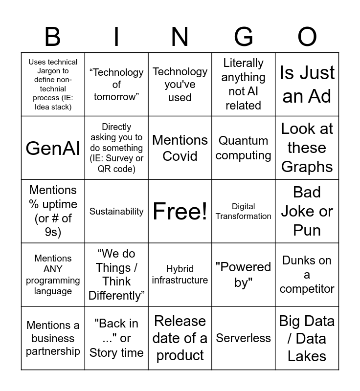 This bingo card has a free space and 24 words: “We do Things / Think Differently”, "Back in ..." or Story time, Mentions Covid, Mentions a business partnership, Is Just an Ad, Uses technical Jargon to define non-technial process (IE: Idea stack), GenAI, “Technology of tomorrow”, Digital Transformation, Hybrid infrastructure, Quantum computing, Mentions % uptime (or # of 9s), "Powered by", Dunks on a competitor, Directly asking you to do something (IE: Survey or QR code), Serverless, Bad Joke or Pun, Technology you've used, Look at these Graphs, Sustainability, Big Data / Data Lakes, Mentions ANY programming language, Literally anything not AI related and Release date of a product.