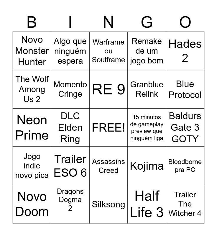 This bingo card has a free space and 24 words: Novo Doom, Trailer ESO 6, RE 9, Half Life 3, Hades 2, Novo Monster Hunter, Algo que ninguém espera, Warframe ou Soulframe, 15 minutos de gameplay preview que ninguém liga, Baldurs Gate 3 GOTY, Neon Prime, Momento Cringe, Kojima, Bloodborne pra PC, The Wolf Among Us 2, Dragons Dogma 2, Silksong, Remake de um jogo bom, Blue Protocol, Jogo indie novo pica, DLC Elden Ring, Assassins Creed, Granblue Relink and Trailer The Witcher 4.