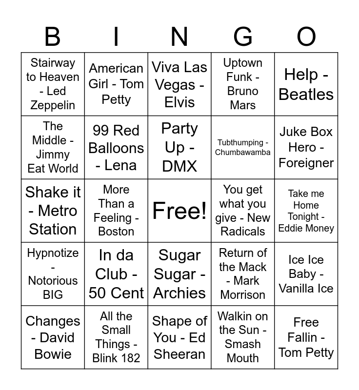 This bingo card has a free space and 24 words: In da Club - 50 Cent, All the Small Things - Blink 182, Party Up - DMX, Changes - David Bowie, Help - Beatles, Stairway to Heaven - Led Zeppelin, The Middle - Jimmy Eat World, American Girl - Tom Petty, You get what you give - New Radicals, Sugar Sugar - Archies, Tubthumping - Chumbawamba, Shake it - Metro Station, Return of the Mack - Mark Morrison, Ice Ice Baby - Vanilla Ice, 99 Red Balloons - Lena, Walkin on the Sun - Smash Mouth, Take me Home Tonight - Eddie Money, Viva Las Vegas - Elvis, Juke Box Hero - Foreigner, More Than a Feeling - Boston, Free Fallin - Tom Petty, Hypnotize - Notorious BIG, Uptown Funk - Bruno Mars and Shape of You - Ed Sheeran.