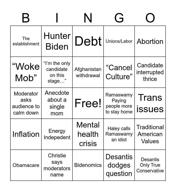 This bingo card has a free space and 24 words: Energy Indepedent, Christie says moderators name, Afghanistan withdrawal, Obamacare, Abortion, The establishment, “Woke Mob”, Hunter Biden, Ramaswamy Paying people more to stay home, Mental health crisis, “Cancel Culture”, Moderator asks audience to calm down, Haley calls Ramaswamy an idiot, Traditional American Values, “I’m the only candidate on this stage…”, Desantis dodges question, Trans issues, Debt, Candidate interrupted thrice, Anecdote about a single mom, Desantis Only True Conservative, Inflation, Unions/Labor and Bidenomics.