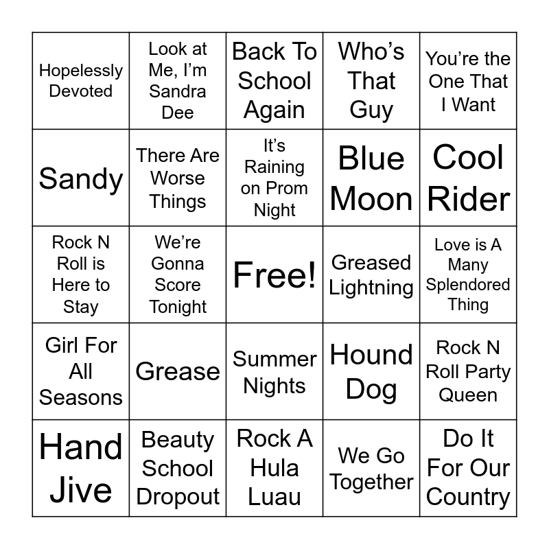 This bingo card has a free space and 24 words: Grease, Beauty School Dropout, It’s Raining on Prom Night, Hand Jive, You’re the One That I Want, Hopelessly Devoted, Sandy, Look at Me, I’m Sandra Dee, Greased Lightning, Summer Nights, Blue Moon, Rock N Roll is Here to Stay, Hound Dog, Rock N Roll Party Queen, There Are Worse Things, We Go Together, Love is A Many Splendored Thing, Back To School Again, Cool Rider, We’re Gonna Score Tonight, Do It For Our Country, Girl For All Seasons, Who’s That Guy and Rock A Hula Luau.