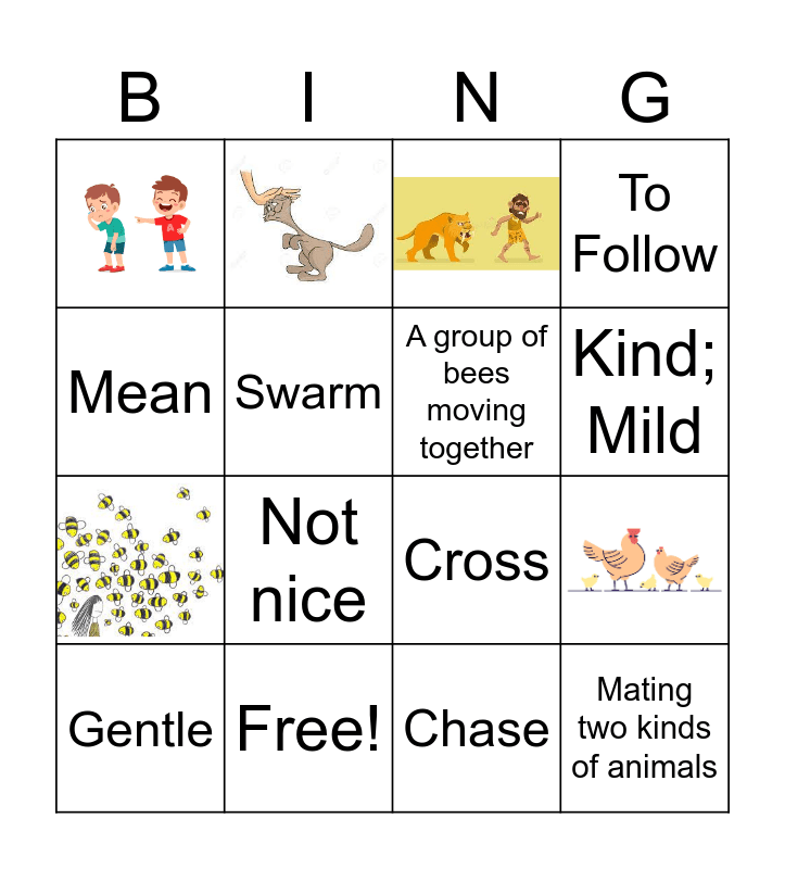 This bingo card has 5 images and 11 words: Free!, Cross, Chase, Mean, Swarm, Gentle, To Follow, Not nice, Kind; Mild, A group of bees moving together and Mating two kinds of animals.