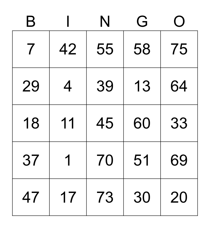 This bingo card has a free space and 24 words: 1, 17, 39, 47, 75, 7, 29, 42, 60, 70, 13, 18, 51, 69, 4, 30, 33, 55, 64, 11, 20, 37, 58 and 73.