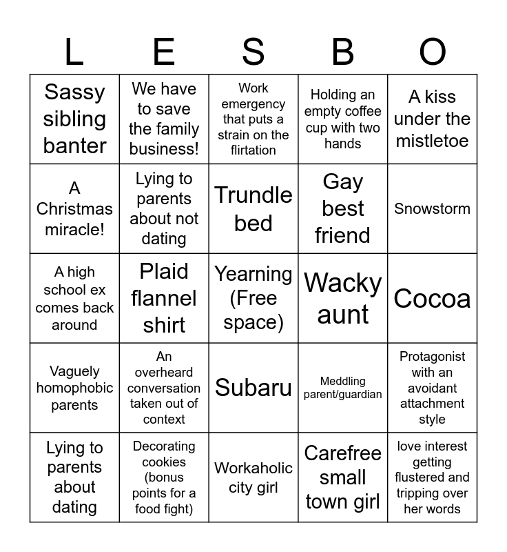 This bingo card has a free space and 24 words: Lying to parents about dating, An overheard conversation taken out of context, Trundle bed, Carefree small town girl, A kiss under the mistletoe, Sassy sibling banter, We have to save the family business!, Work emergency that puts a strain on the flirtation, Wacky aunt, Cocoa, A high school ex comes back around, Lying to parents about not dating, Meddling parent/guardian, Protagonist with an avoidant attachment style, A Christmas miracle!, Decorating cookies (bonus points for a food fight), Workaholic city girl, Holding an empty coffee cup with two hands, Snowstorm, Vaguely homophobic parents, Plaid flannel shirt, Subaru, Gay best friend and love interest getting flustered and tripping over her words.