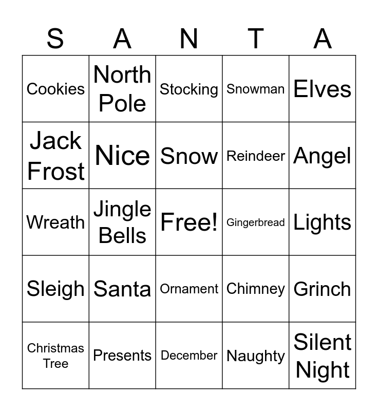 This bingo card has a free space and 24 words: Santa, Presents, Snow, Christmas Tree, Elves, Cookies, Jack Frost, North Pole, Gingerbread, Ornament, Reindeer, Wreath, Chimney, Grinch, Nice, Naughty, Lights, Stocking, Angel, Jingle Bells, Silent Night, Sleigh, Snowman and December.