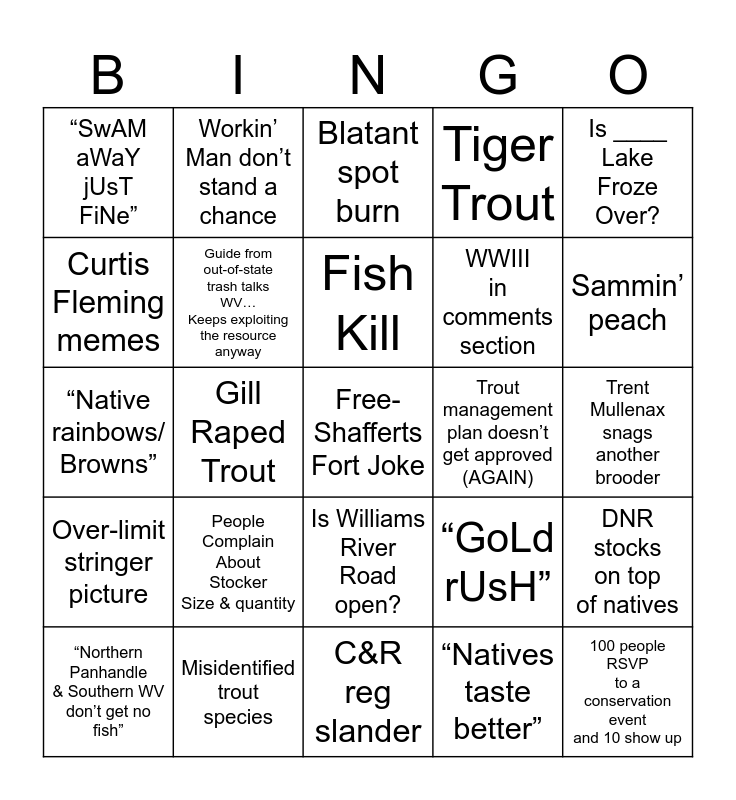 This bingo card has a free space and 24 words: People Complain About Stocker Size & quantity, Misidentified trout species, Fish Kill, “Northern Panhandle & Southern WV don’t get no fish”, Is ____ Lake Froze Over?, “SwAM aWaY jUsT FiNe”, Curtis Fleming memes, Workin’ Man don’t stand a chance, Trout management plan doesn’t get approved (AGAIN), Is Williams River Road open?, WWIII in comments section, “Native rainbows/ Browns”, “GoLd rUsH”, DNR stocks on top of natives, Guide from out-of-state trash talks WV… Keeps exploiting the resource anyway, “Natives taste better”, Trent Mullenax snags another brooder, Blatant spot burn, Sammin’ peach, Gill Raped Trout, 100 people RSVP to a conservation event and 10 show up, Over-limit stringer picture, Tiger Trout and C&R reg slander.