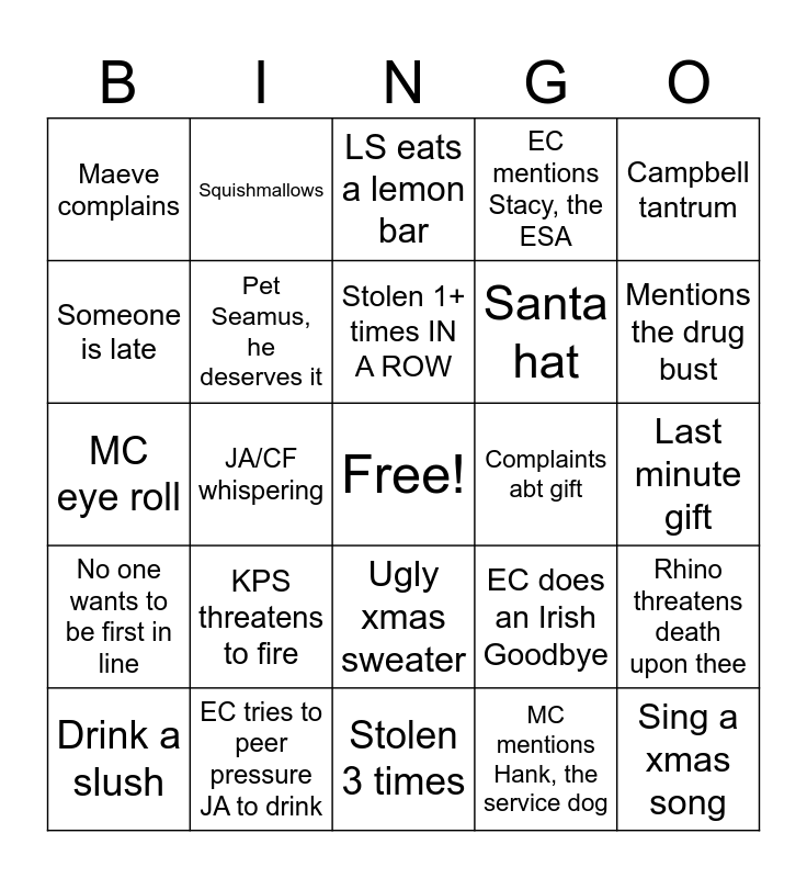 This bingo card has a free space and 25 words: KPS threatens to fire, Stolen 3 times, Stolen 1+ times IN A ROW, Drink a slush, Campbell tantrum, Maeve complains, Someone is late, Squishmallows, Complaints abt gift, Ugly xmas sweater, Santa hat, MC eye roll, EC does an Irish Goodbye, Rhino threatens death upon thee, Pet Seamus, he deserves it, CHVH staff end up at the "Kids Table", Last minute gift, LS eats a lemon bar, Mentions the drug bust, JA/CF whispering, Sing a xmas song, EC tries to peer pressure JA to drink, No one wants to be first in line, EC mentions Stacy, the ESA and MC mentions Hank, the service dog.