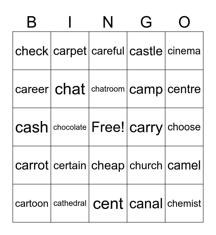 This bingo card has a free space and 28 words: camel, camera, camp, canal, career, careful, carpet, carrot, carry, cartoon, cash, castle, cathedral, cent, centre, century, certain, chat, chatroom, cheap, check, cheese, chemist, chocolate, choose, church, cinema and circus.
