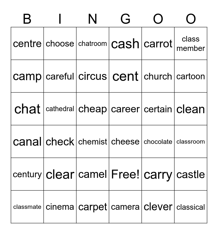 This bingo card has 36 words: Free!, camel, camera, camp, canal, career, careful, carpet, carrot, carry, cartoon, cash, castle, cathedral, cent, centre, century, certain, chat, chatroom, cheap, check, cheese, chemist, chocolate, choose, church, cinema, circus, class member, classical, classmate, classroom, clean, clear and clever.
