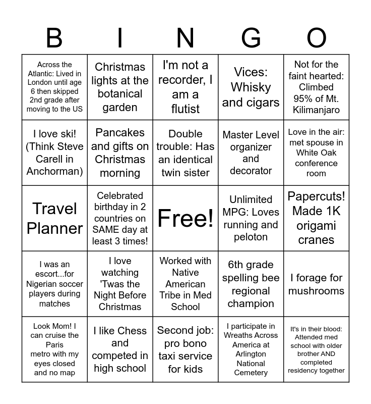 This bingo card has a free space and 24 words: I love watching 'Twas the Night Before Christmas, I like Chess and competed in high school, Double trouble: Has an identical twin sister, Look Mom! I can cruise the Paris metro with my eyes closed and no map, Not for the faint hearted: Climbed 95% of Mt. Kilimanjaro, Across the Atlantic: Lived in London until age 6 then skipped 2nd grade after moving to the US, I love ski! (Think Steve Carell in Anchorman), Christmas lights at the botanical garden, Unlimited MPG: Loves running and peloton, Worked with Native American Tribe in Med School, Master Level organizer and decorator, Travel Planner, 6th grade spelling bee regional champion, I forage for mushrooms, Pancakes and gifts on Christmas morning, I participate in Wreaths Across America at Arlington National Cemetery, Papercuts! Made 1K origami cranes, I'm not a recorder, I am a flutist, Love in the air: met spouse in White Oak conference room, Celebrated birthday in 2 countries on SAME day at least 3 times!, It's in their blood: Attended med school with older brother AND completed residency together, I was an escort...for Nigerian soccer players during matches, Vices: Whisky and cigars and Second job: pro bono taxi service for kids.